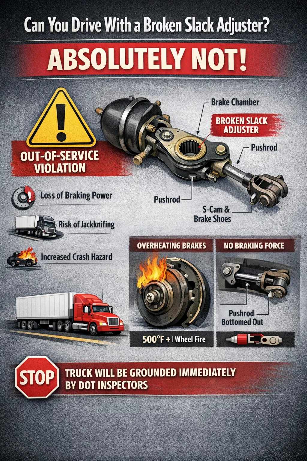 짧은 대답은 절대 그렇지 않습니다. 파손, 오작동 또는 부적절하게 조정된 슬랙 조정 장치가 있는 상업용 차량은 합법적으로 또는 안전하게 운전할 수 없습니다. 교통부(DOT)와 안전 검사관의 눈에는 파손된 느슨한 조절기 "서비스 중단" 위반입니다. 이러한 결함이 있는 차량을 운전하다가 적발되면 트럭은 즉시 검사 현장에서 운행 정지됩니다.