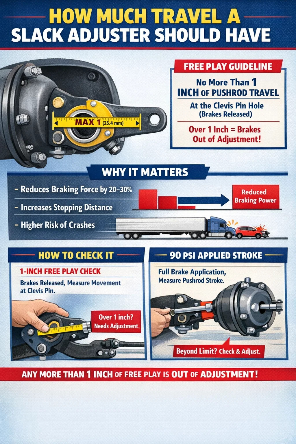 에이 느슨한 조절기 — 수동이든 자동이든 — 1인치(25.4mm) 이하의 푸시로드 이동 브레이크가 완전히 풀렸을 때 클레비스 핀 구멍에서 측정됩니다. 이는 49 CFR Part 393.47에 따라 FMCSA(Federal Motor Carrier Safety Administration)에서 정한 표준이며, 미국 도로에서 운행되는 상업용 자동차에 적용됩니다.