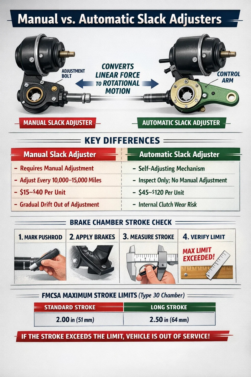 FMCSA 규정에 따라 북미에서 법적으로 요구되는 최대 브레이크 챔버 스트로크는 챔버 크기에 따라 정의됩니다. 유형 30 챔버의 경우 해당 제한은 2인치(51mm)입니다. 이를 초과하면 차량 서비스가 중단됩니다. 조정 범위가 벗어나거나, 압수되거나, 마모된 느슨한 조정 장치는 상업용 트럭이 레벨 I 도로 검사를 통과하지 못하는 가장 일반적인 이유 중 하나입니다.