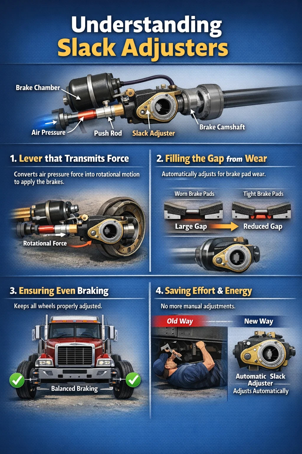 슬랙 조절기 대형트럭이나 버스의 제동장치에 있어서 '번역가'나 '자동관리자'와 같다. 브레이크 챔버와 브레이크 샤프트 사이에 위치합니다.