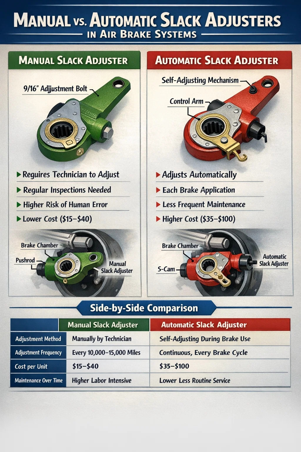차량 관리자, 상업용 운전자, 브레이크 기술자 또는 CDL을 공부하는 사람이든 두 가지 유형을 모두 이해하는 것이 중요합니다. FMCSA 393.47에 따른 연방 규정은 푸시로드 이동에 대해 엄격한 제한을 설정하고 있으며, 조정되지 않은 브레이크로 인해 검사에 실패하면 차량이 즉시 접지될 수 있습니다. 각 유형의 슬랙 조정 장치가 어떻게 작동하는지, 그리고 각각에 어떤 문제가 발생할 수 있는지를 알면 차량이 규정을 준수하고 안전하며 도로에서 유지됩니다.